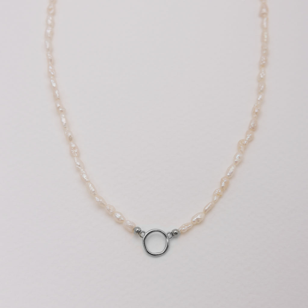 The Eloise Circle Freshwater Pearl Necklace brings modern edge to a timeless classic. Crafted with genuine freshwater pearls, each with its own organic shape, this necklace celebrates individuality — no two are exactly alike. At its center, our signature circle connector, designed with a slightly imperfect organic form, adds character and charm.
